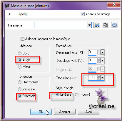 1. Ouvrir un nouveau calque de 900/600 transparent 2. Sélectionner tout /édition copié votre tube Mary 0312-46 3. Edition /coller dans la sélection/désélectionner 4. Effet/effet image/mosaïque sans jointures