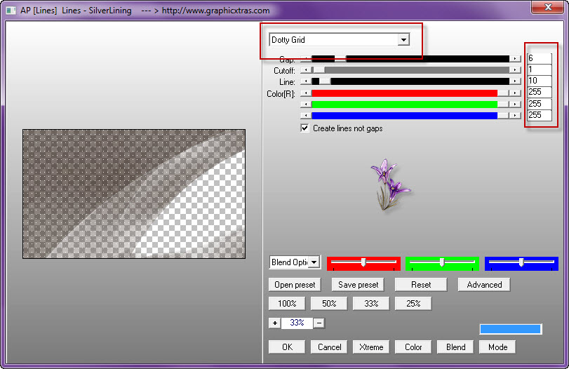 Sélection/transformer la sélection en calque Sélection/modifier/contracter de 50 Appliquer une ombre portée de 0/0/50/40 noir Effet/modules externes/AP Lines/Lines-Silverlining